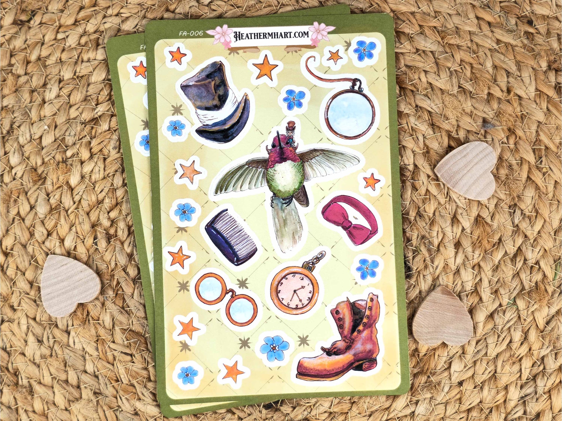 Add a touch of whimsy and class to your projects with this Dapper Hummingbird Sticker Sheet! This sheet features my original illustration of a hummingbird, dressed to the nines with a top hat, bow tie, and pocket watch. These stickers are perfect for anyone who loves whimsical, gentlemanly, or steampunk art.