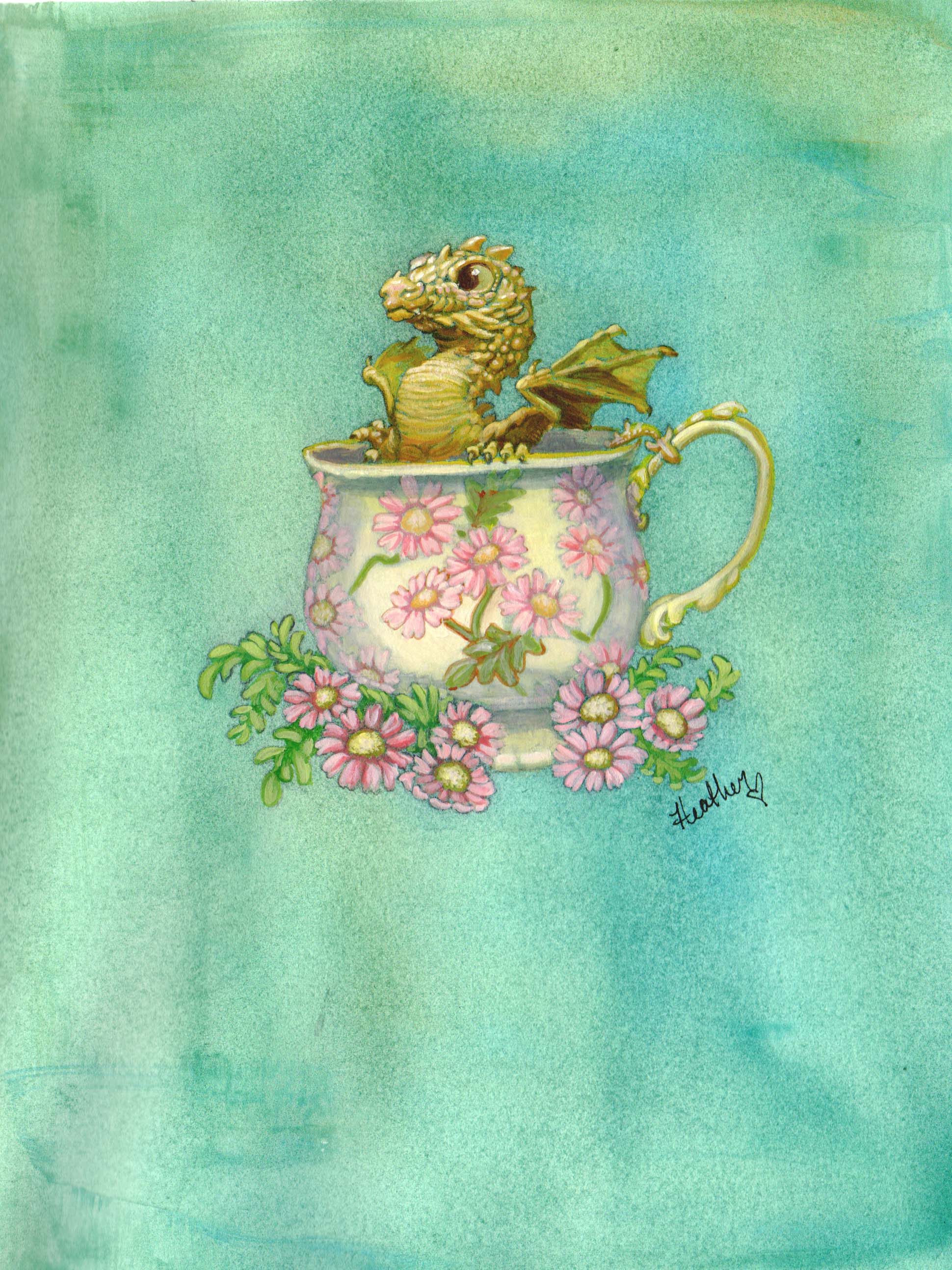 A Whimsical Companion: This isn't just a painting; it's a miniature tale waiting to unfold. Our little golden dragon, with its detailed scales and expressive eyes, gazes out from its floral teacup, inviting you into a world where everyday objects hold extraordinary secrets. It’s a perfect piece for dragon lovers, tea enthusiasts, and collectors of unique, whimsical fantasy art.